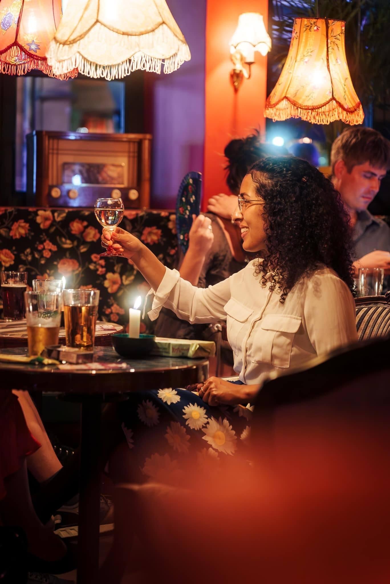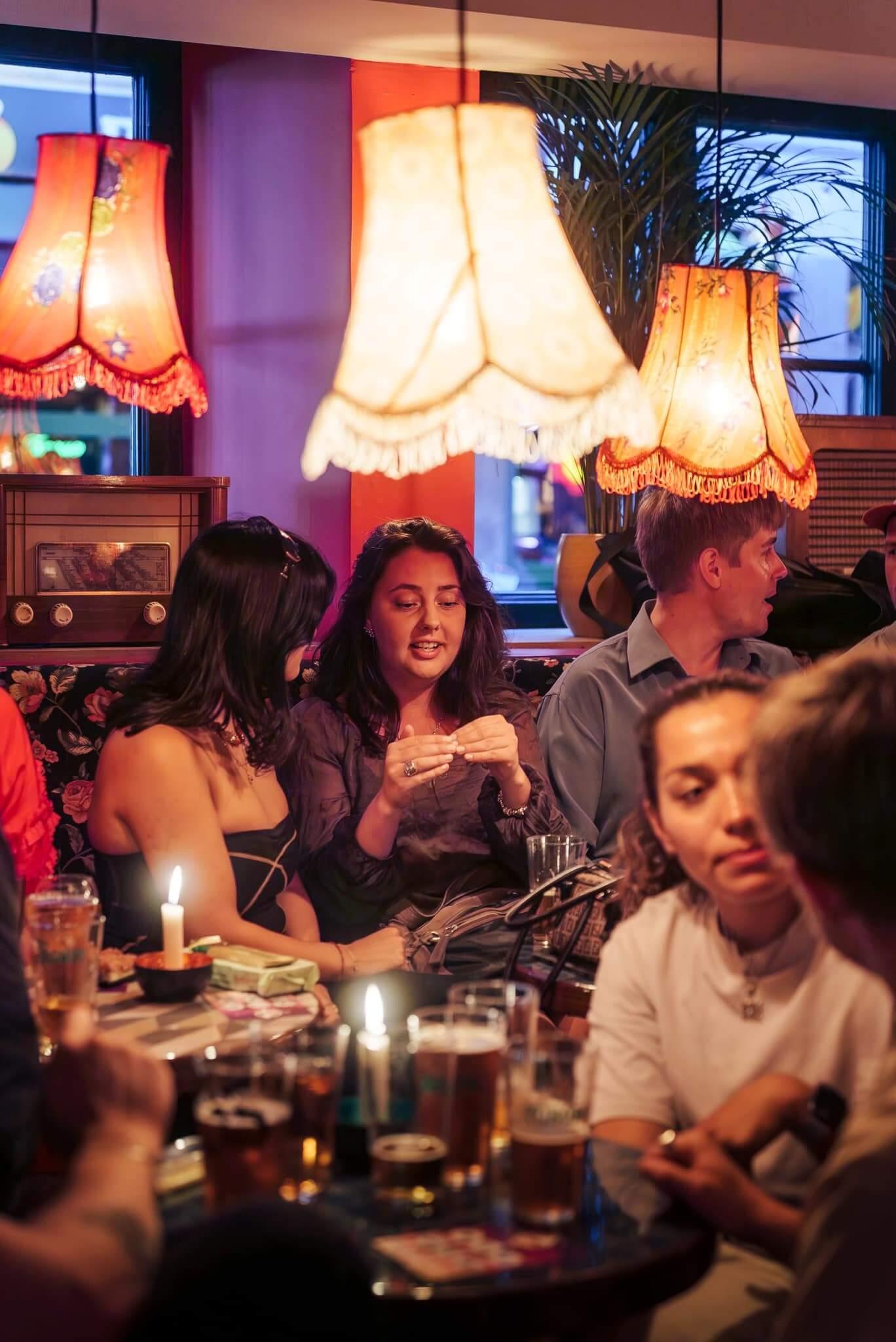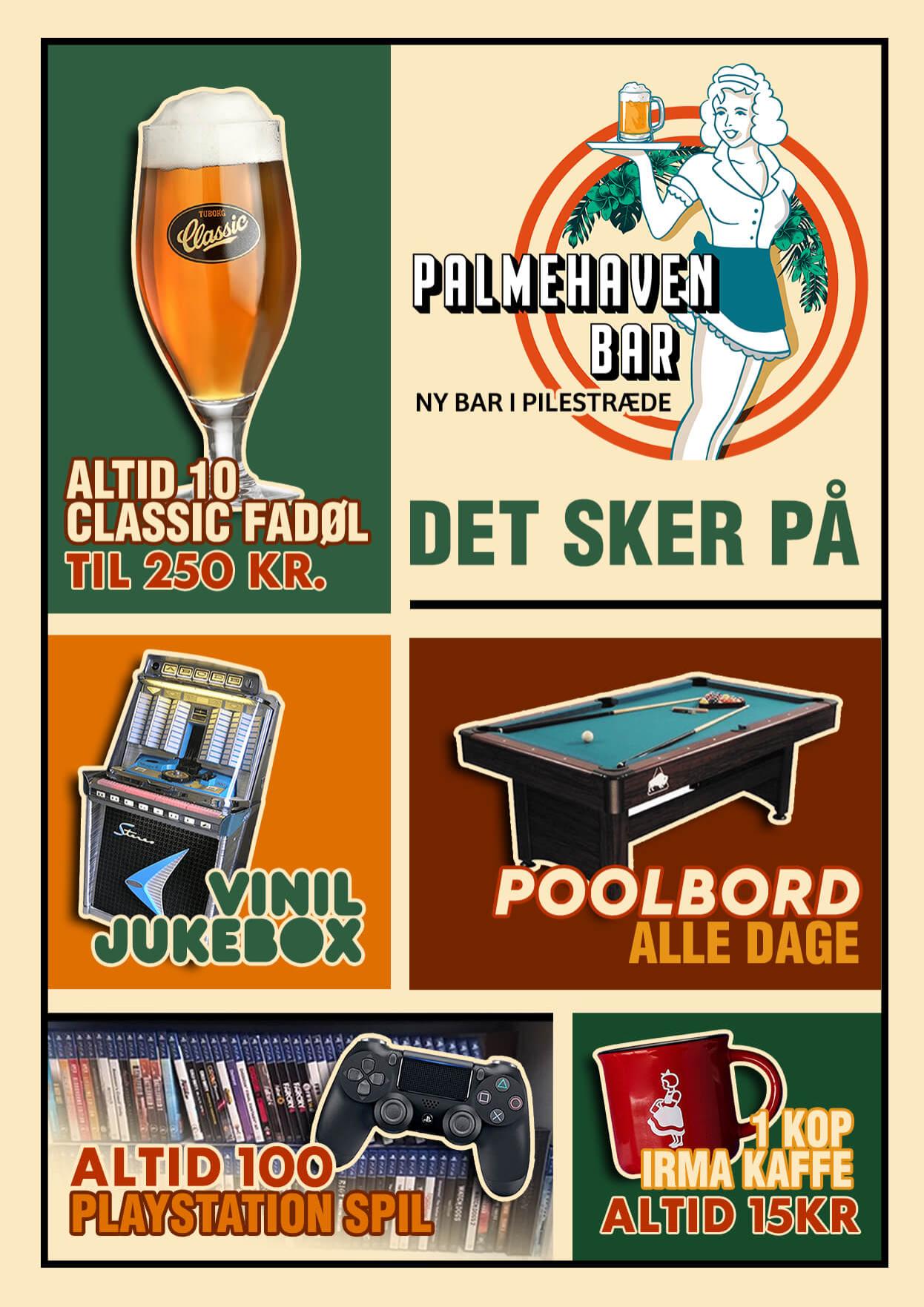 Velkommen til Palmehaven – hvor dansk hygge møder feststemning I hjertet af København, på Pilestræde 43, finder I Palmehaven – en autentisk dansk bar, hvor stemningen er lige dele afslappet og festlig. Her hyldes alt det bedste fra det danske land i en atmosfære, der forener klassisk indretning med moderne elementer. Uanset om I søger en hyggelig eftermiddag med kaffe og kage eller en livlig aften med cocktails og dans, står Palmehaven klar til at tage imod jer. Fra det øjeblik I træder ind, vil I føle jer hjemme i de stemningsfulde omgivelser, hvor dansk nostalgi møder nutidens festkultur.Unikke omgivelser med plads til både hygge og fest Palmehavens indretning er en kærlig hyldest til dansk design og hyggekultur. Her blandes blomstrede sofaer, antikke stole og klassiske tæpper med moderne detaljer som neonlys og spillemaskiner. Hvert hjørne af baren gemmer på en ny oplevelse – fra det energifyldte dansegulv til de hyggelige sofakroge. Udfordr vennerne i pool, dyst i PlayStation-spil, eller slap af med en velskænket øl i barens varme og imødekommende atmosfære. Med plads til både intime samtaler og store fester kan Palmehaven tilpasses enhver anledning, hvad enten det er en uformel aften med venner eller en større firmafest.Danske smagsoplevelser i baren Palmehavens menu er en hyldest til dansk mad- og drikkekultur. Her kan I nyde et bredt udvalg af danske øl, kreative cocktails inspireret af klassiske danske ingredienser samt velsmagende snacks. Prøv en innovativ cocktail lavet med marmelade fra Den Gamle Fabrik, eller nyd en friskbrygget kop Irma-kaffe sammen med et stykke drømmekage fra Karen Volf. Til særlige arrangementer tilbyder Palmehaven samarbejde med professionelle cateringfirmaer, der kan levere alt fra lette anretninger til overdådige buffeter – altid med fokus på kvalitet og tradition.Skræddersyede arrangementer med personlig service Palmehaven er det oplagte valg, når I vil skabe en fest, der huskes. Det erfarne personale står klar til at hjælpe jer med at planlægge og skræddersy jeres event ned til mindste detalje. Fra den første idé til den sidste dans sørger de for, at alt forløber glat, så I kan nyde aftenen uden bekymringer. Uanset om I ønsker live-musik, stand-up, en underholdende quiz eller noget helt fjerde, kan Palmehavens team arrangere det for jer. Her er mulighederne uendelige – kun fantasien sætter grænser.Lad Palmehaven danne rammen om jeres næste uforglemmelige aften, hvor dansk hygge og fest går op i en højere enhed.