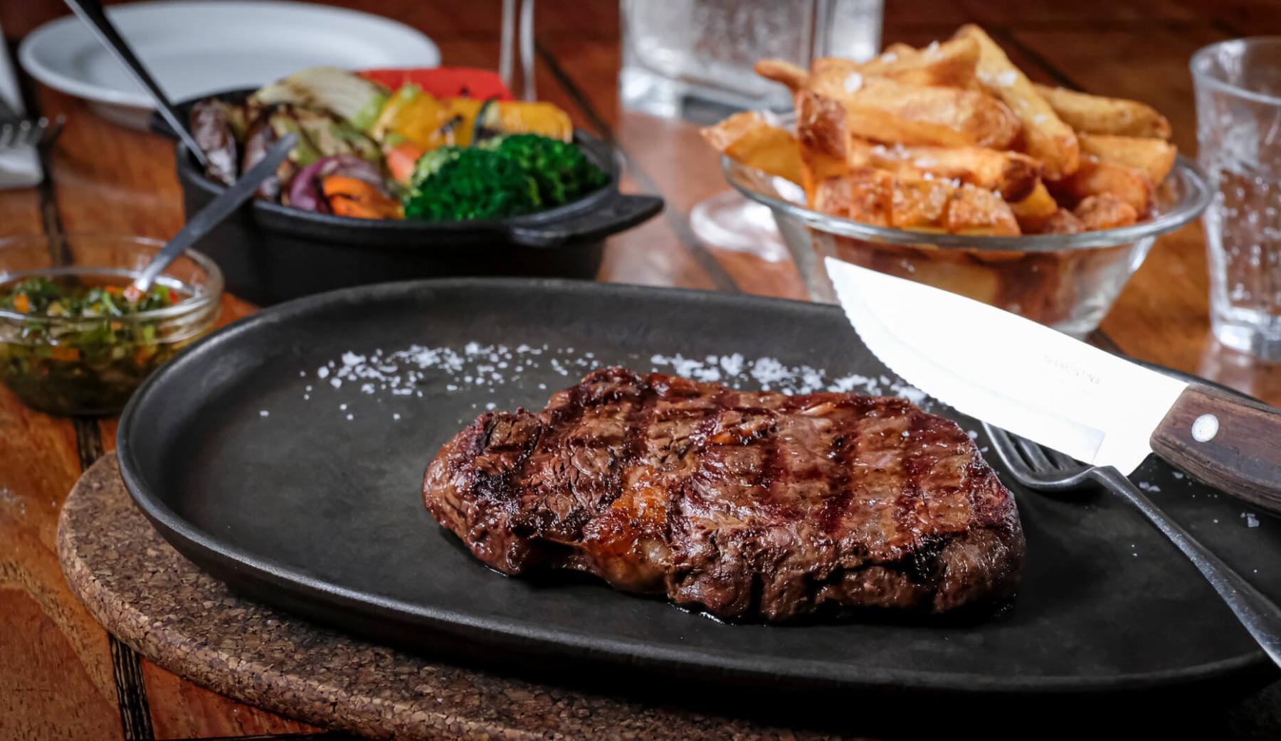 Hovedret: Churrasco ca.200gr. Black Angus Ribeye serveres med kokkens valg tilbehør (salat/mos/pommes) og Chimichurri