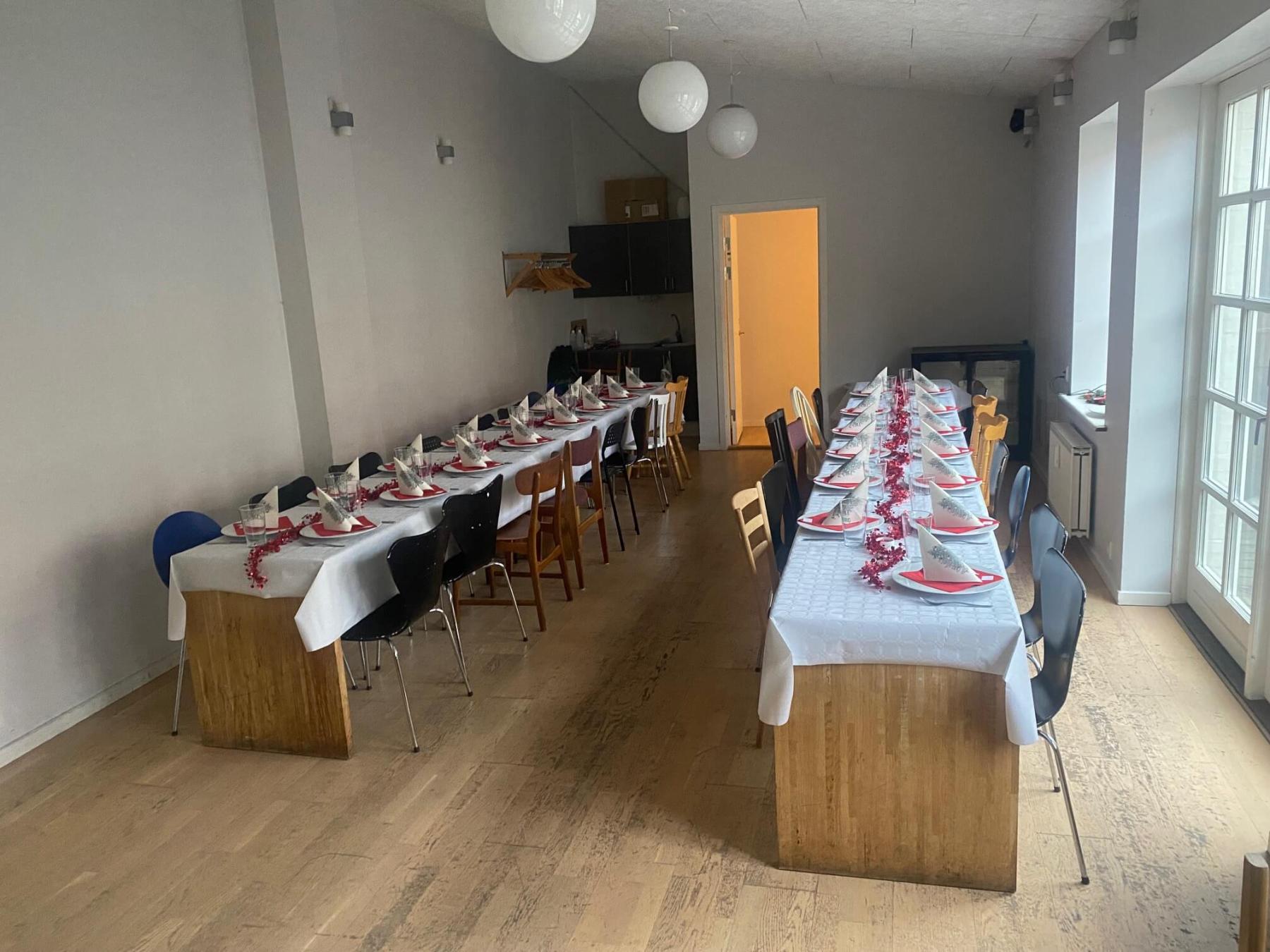 Vores selskabslokale i Aalborg er på 65 kvm her medfølger et lille anretningskøkken, samt plads til overtøj.Teknisk udstyr: Musikanlæg Bordopstillingsmuligheder: langborde(40)